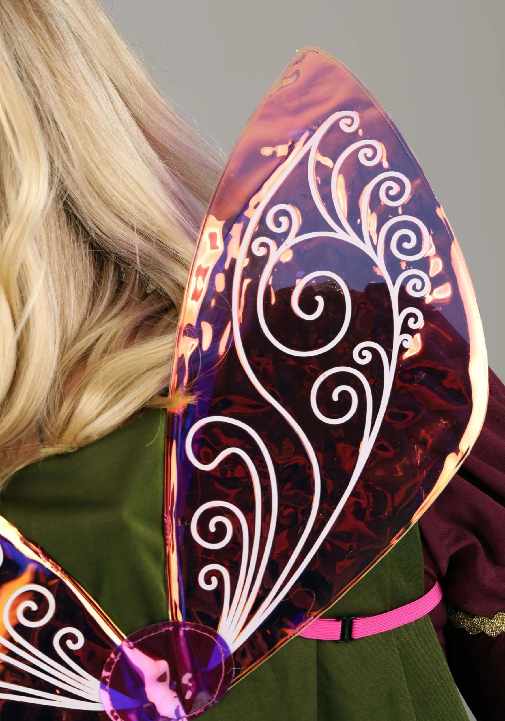Everyone will know that you’re a good fairy when you wear this exclusive, officially licensed Disney Flora the Fairy Headband and Wings Kit! A mini pink hat with a pointed crown and a gauzy ribbon band perches perkily on your head thanks to the attached cloth-covered headband. The matching wings secure over your shoulders with adjustable straps and have a lovely swirl design.