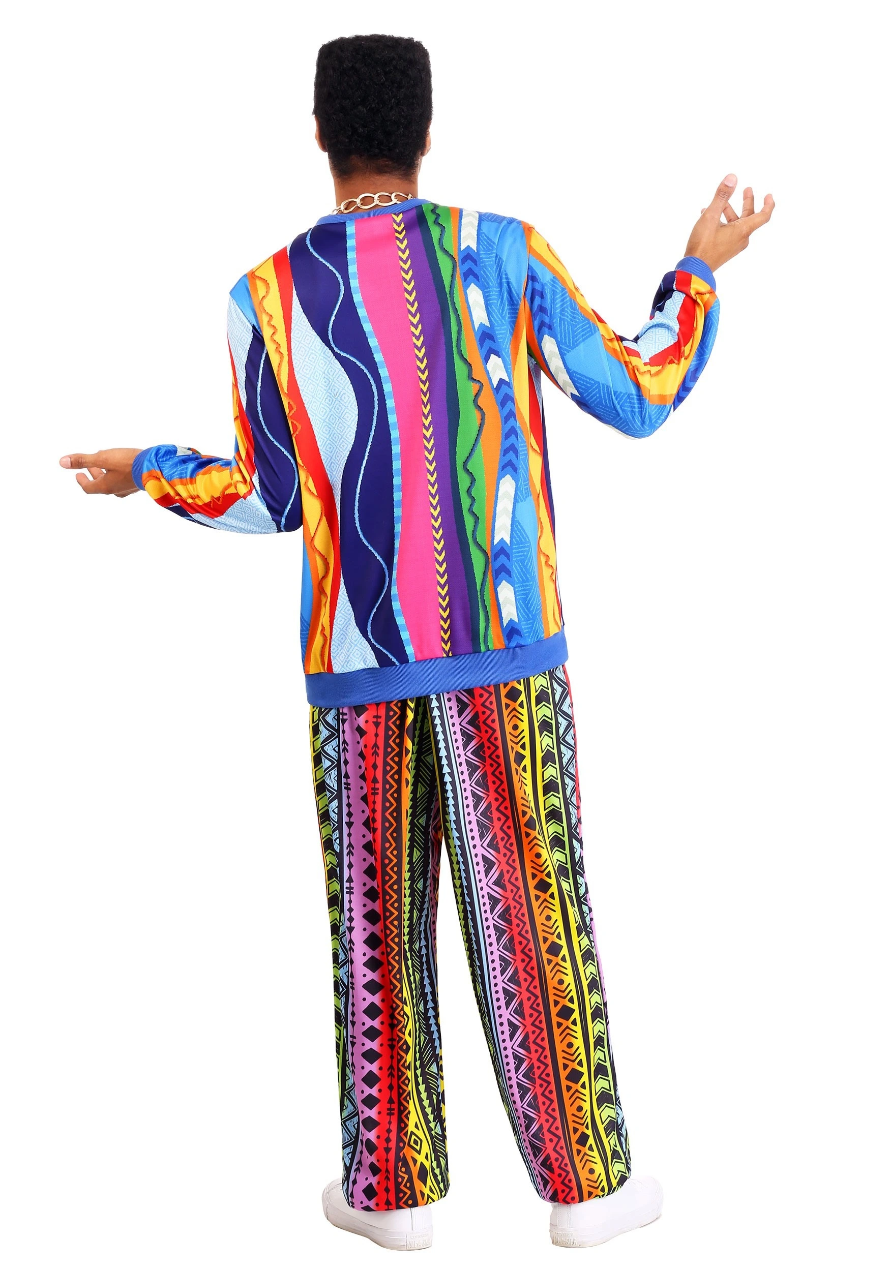 Our costume designers worked hard to capture the very essence of the 90s in this colorful costume. The watched tons of 90s TV. They listened to a bunch of New Jack Swing and early 90s golden age hip hop. It shows in this retro design. This costume comes with a sweater and a pair of pants, both of which feature a brightly colored print design. The pants have an elastic band for a comfortable fit. Finally, the included chain comes in a metallic gold color to add a nostalgic touch to the whole outfit. Pair it all with your best pair of kicks and you can proclaim yourself the prince of your neighborhood!
