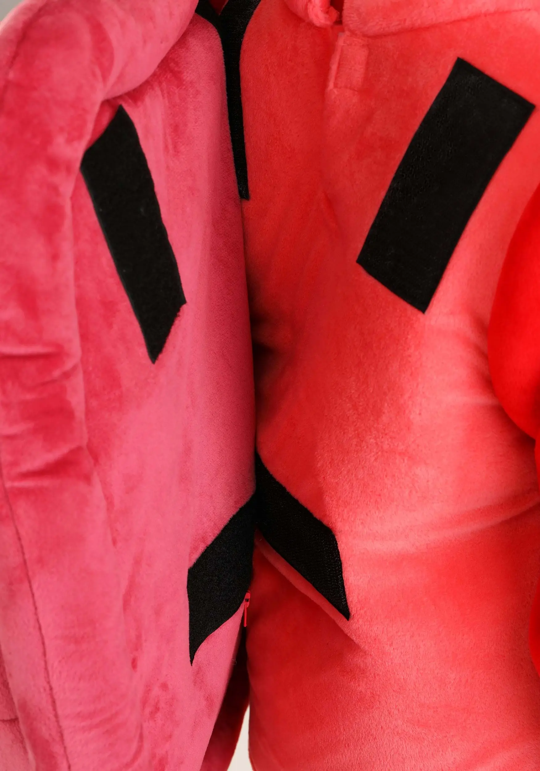 - Foam-backed minky shell secures to the back of the bodysuit w/ hook and loop fasteners