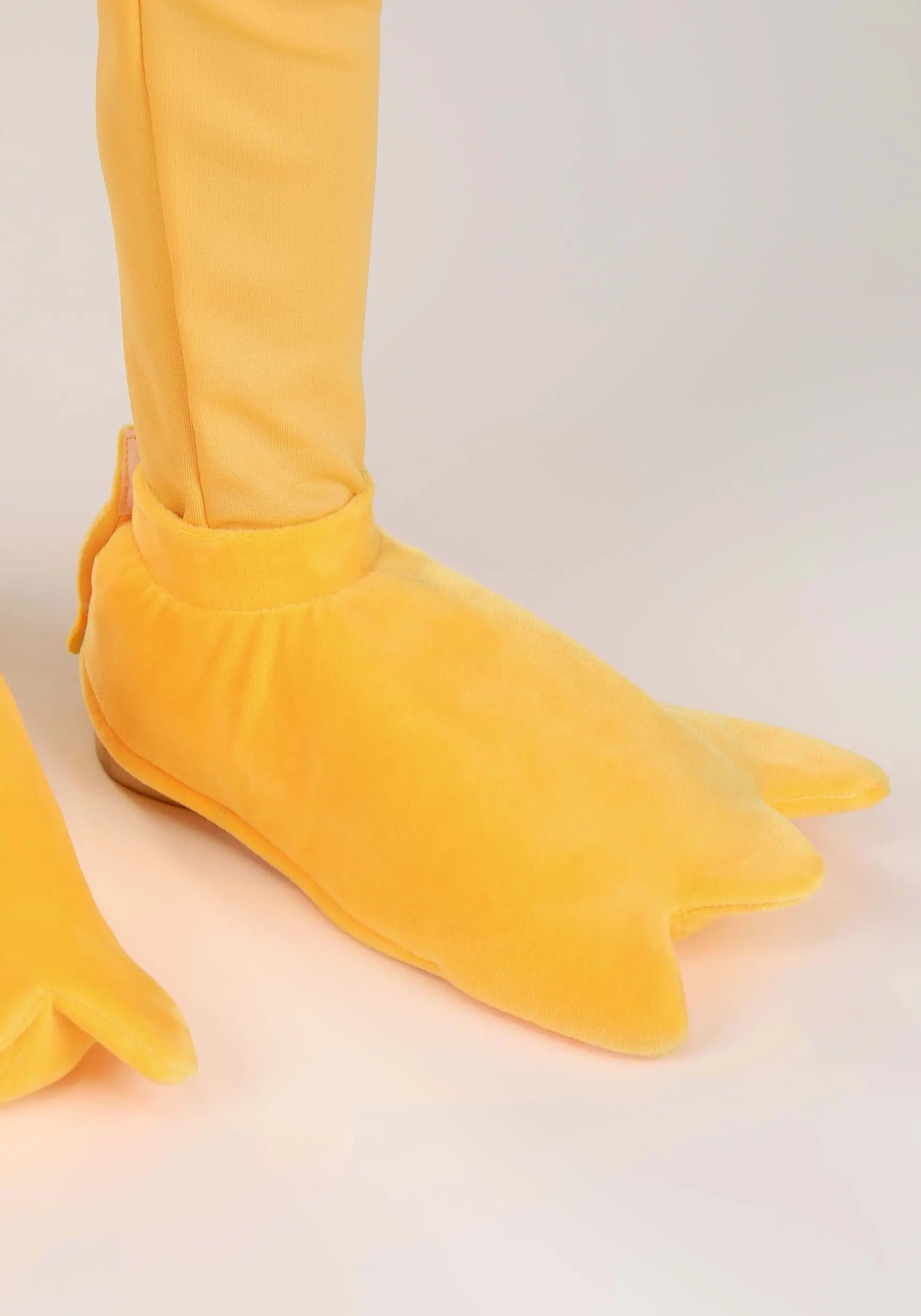 Meanwhile, yellow trim, appliqued imitation buttons, and a red bow tie ensure the top looks just like Donald’s. The wearer fully takes on Donald’s appearance with the soft-sculpted hood secured under their chin. Finally, orange leggings and a pair of faux feather gloves are included to complete the full look.