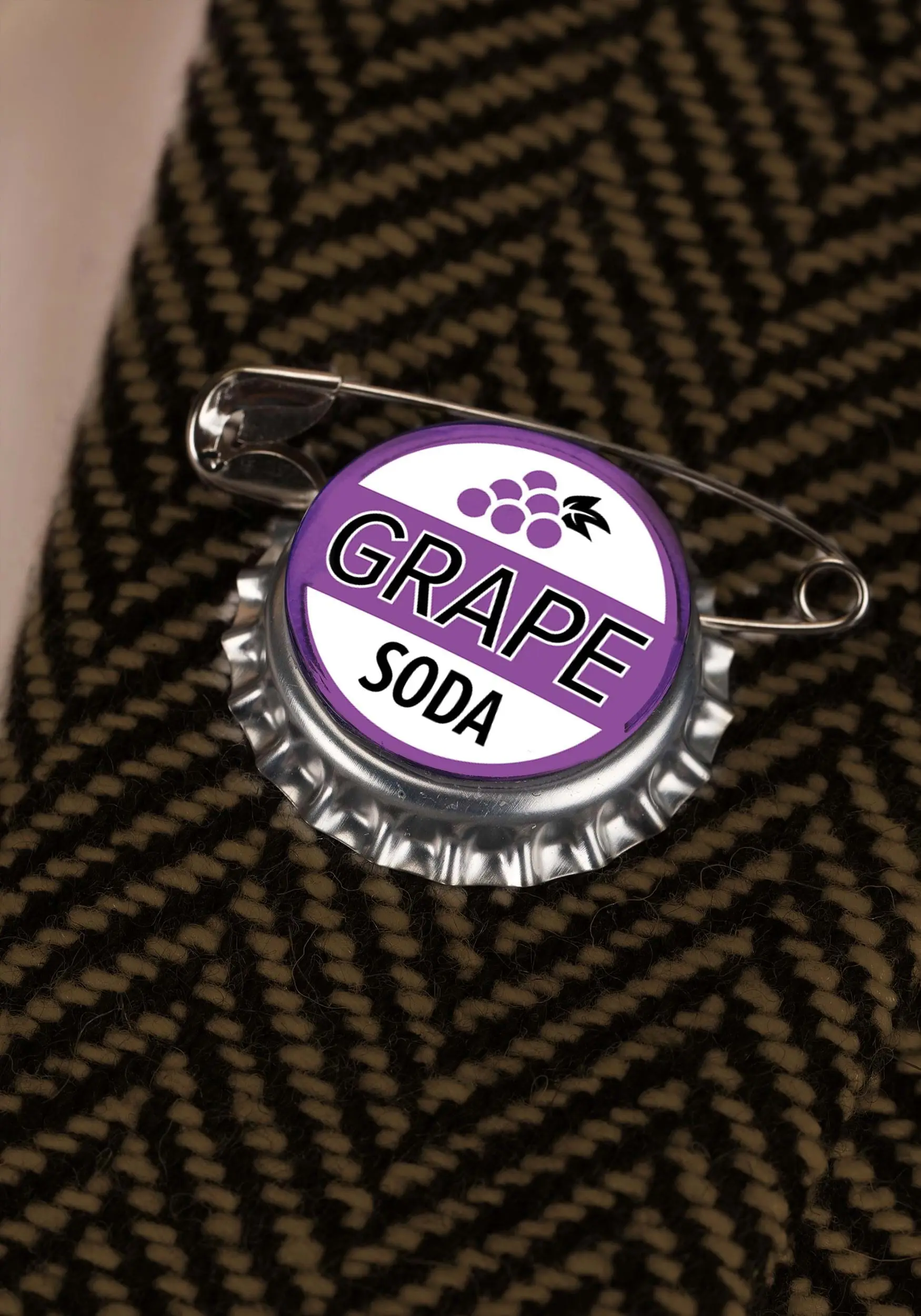 - Bottlecap-shaped pin is approx. 12.5″ diameter, has safety pin backing