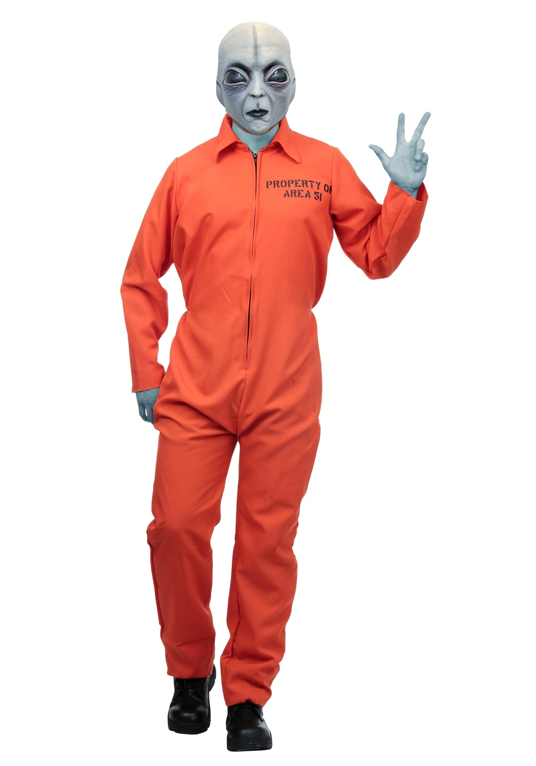 Bring some out-of-this-world fun to your next costume party in this Adult Area 51 Escapee Costume. The orange jumpsuit is made from 100 percent polyester fabric and has a zipper down the center front for easy wear. There is printed wording on the front and back of the jumpsuit. There costume also comes with a latex alien mask with eye holes that allow for limited vision. The mask has an elastic band attached to secure it to your head.