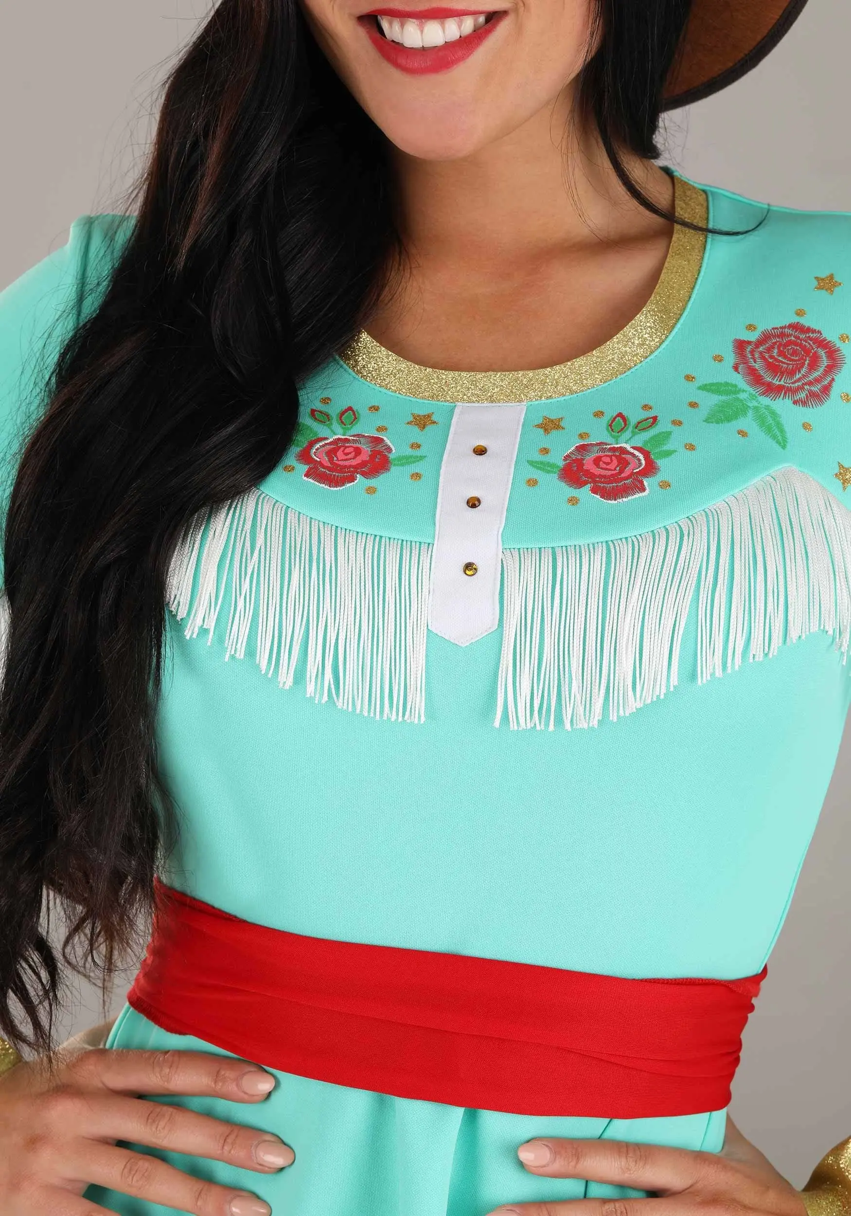You can sing your heart out when you wear this Women’s Country Star Costume Dress. The plus size outfit is modeled after dresses worn by various country Western stars throughout! It consists of a pullover-style dress that stretches for a comfortable fit. The turquoise color strikes a vibrant contrast to the red flower patterns around the skirt and along the chest.