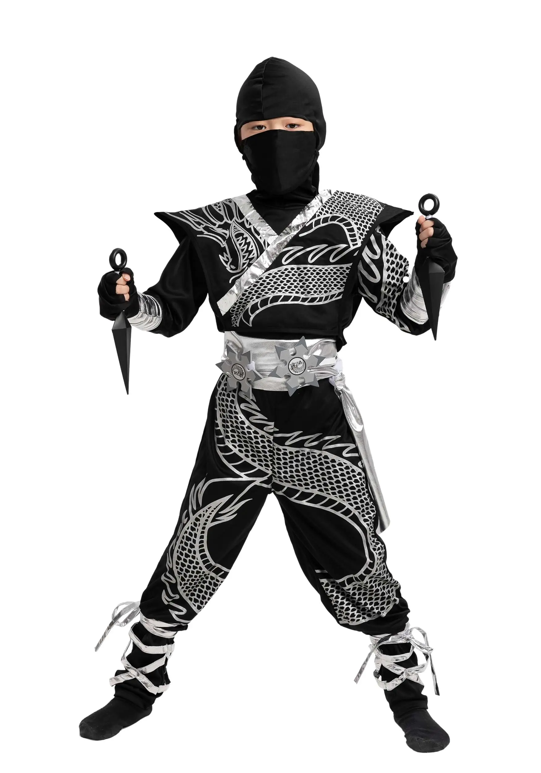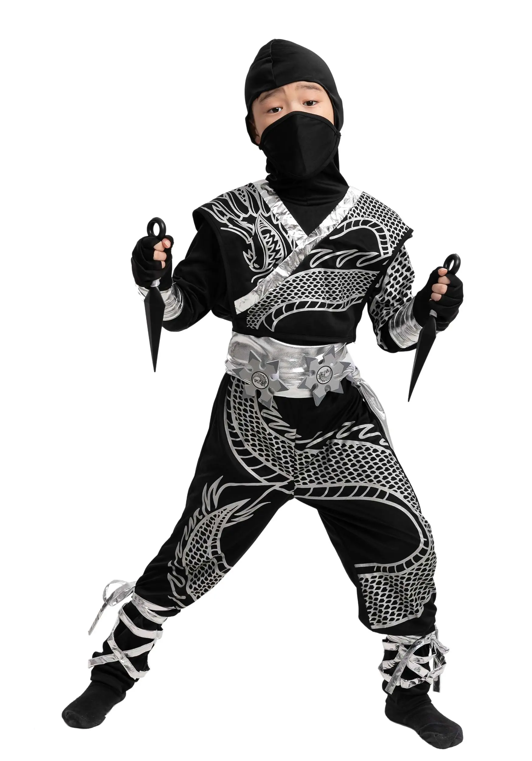 Help your tyke channel their mystical might when you give them this Child Dragon Ninja costume. This ensemble includes all that your kiddo will need to feel like they stepped right out of an epic video game or anime! The black jumpsuit features metallic printing that looks like a soaring dragon tail. Ribbons at the legs and an attached black hood create a silhouette that will have your kid feeling a real part of the fun. Kid-safe, foam weaponry can be worn on the silver belt or held in hand for an action-packed look. They include faux ninja stars and two foam kunai with open loops for your kiddo’s fingers. They’re just perfect with the fingerless gloves that finish off your little ninja’s transformation.