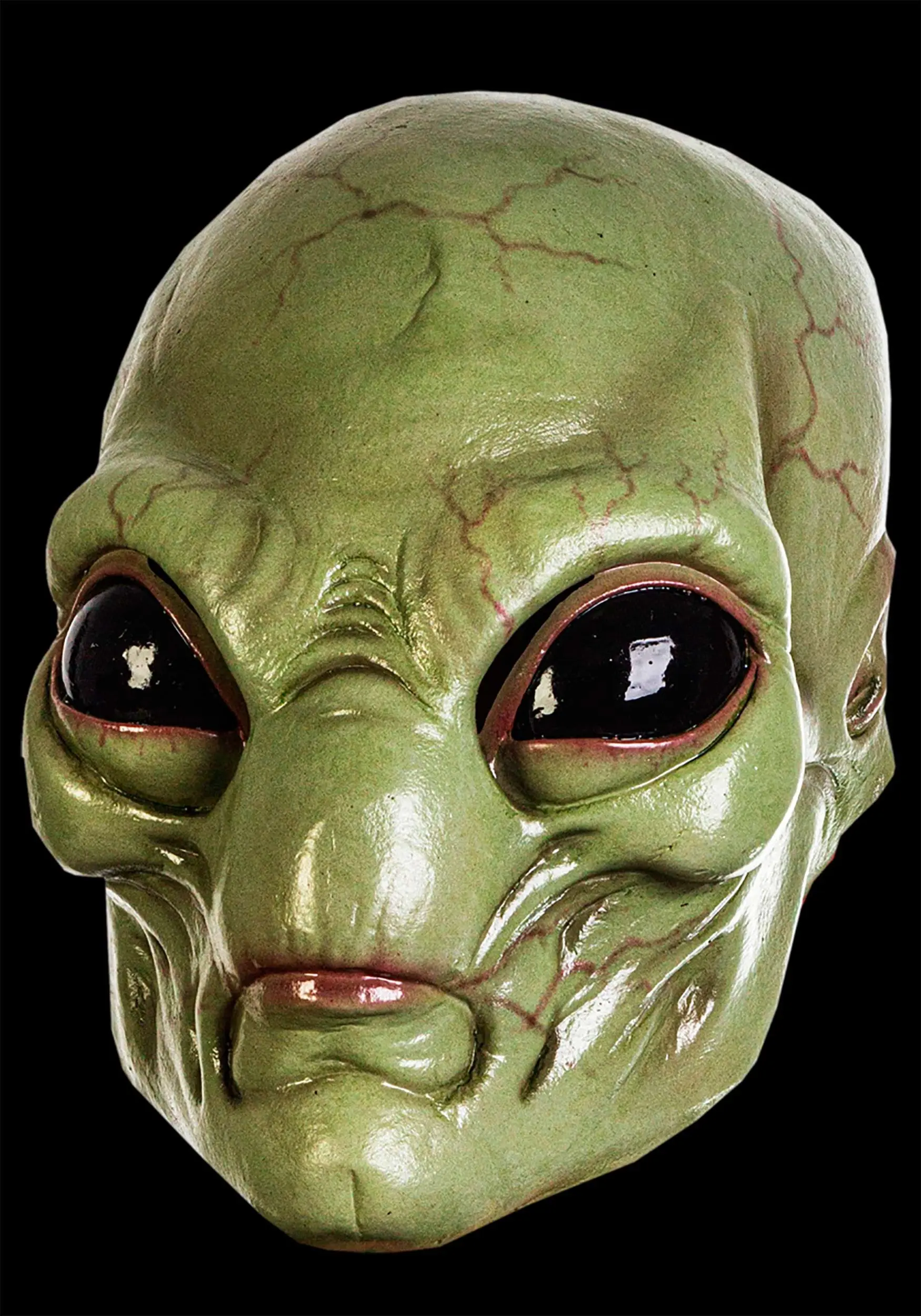 Start your fact-finding mission to this strange and noisy planet by wearing your Green Visitor Mask for Adults! The latex mask conceals your entire face and is molded to look like a semi-reptilian classic alien face. It’s painted to have green skin with brown markings and big black peepers.