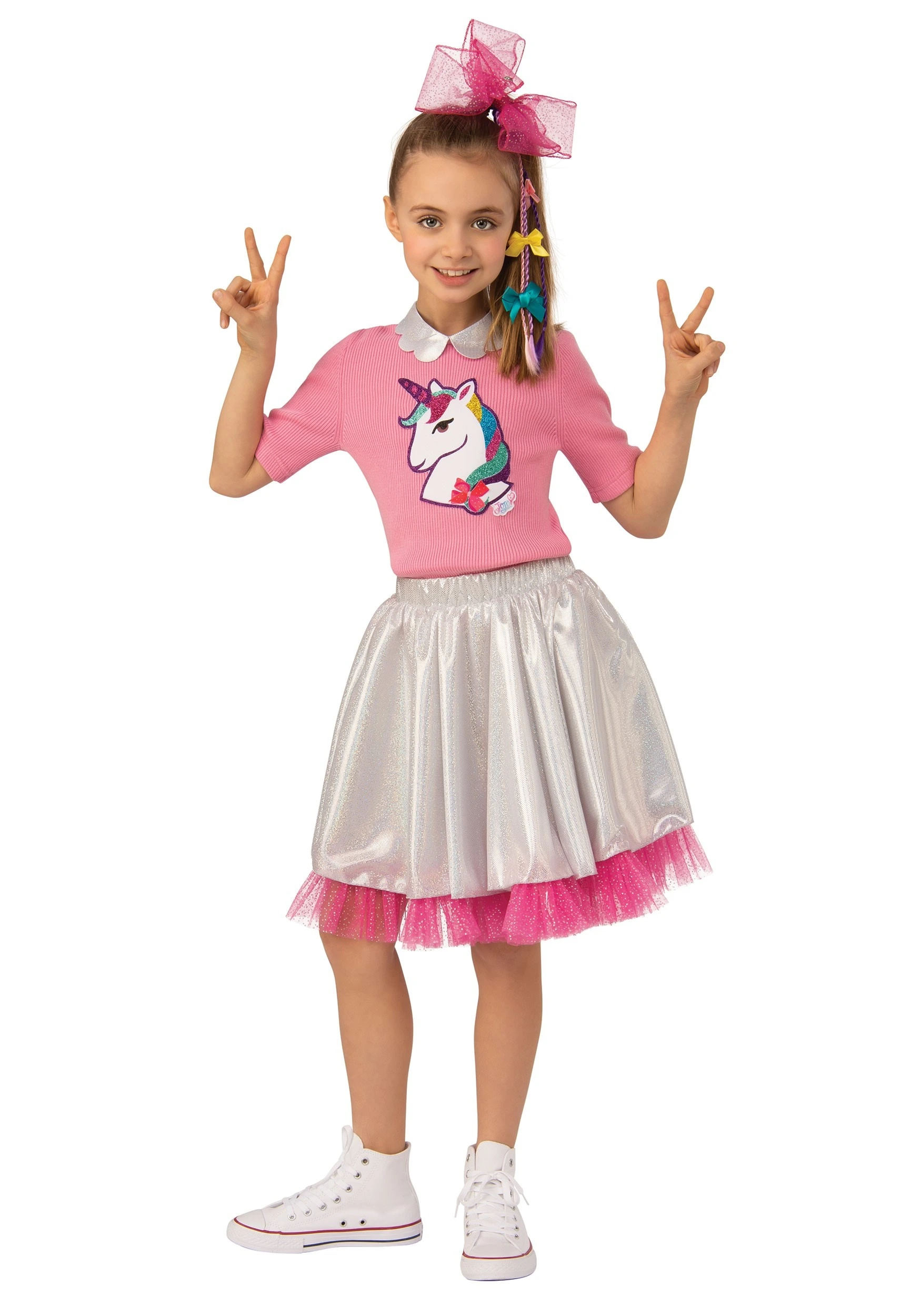 This 100% polyester costume is based off of her viral music video of the same name. It nails JoJo’s iconic style: bright, plenty of pink, and (of course) topped with a giant bow! The pink shirt features a sequined unicorn head and satin-like shirt collar. The elastic, sequins knit skirt matches the collar and is hemmed in bright pink tulle. One massive pink bow wasn’t enough, so the hair clip also features three colorful braids with smaller bows attached. If bows really are a superpower, your child is ready to save the world!